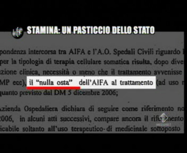 L’inviato de Le Iene spiega che già nel 2011 Aifa, l’Agenzia Italiana del Farmaco, aveva concesso il nulla osta per fare partire le terapie, mostrando anche lo stralcio della lettera che era stata inviata all’Ospedale (nella gallery):