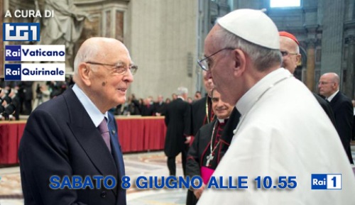Papa Francesco e il Presidente della Repubblica Giorgio Napolitano si incontrano oggi sabato 8 giugno 2013 in diretta televisiva. L’incontro ufficiale sarà trasmesso da Rai 1 alle ore 10.55 fino alle 11.55. Papa Francesco e Giorgio Napolitano si erano già incontrati in occasione della messa per l’inizio del ministero petrino, ma l’incontro di oggi rappresenta la prima visita ufficiale, per questo testimoniata dalle telecamere Rai.