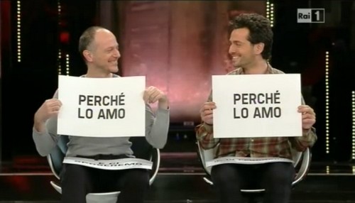 La coppia, nel video online, si scambia un tenero bacio. Sul palco dell’Ariston, invece, Fabio Fazio si è affrettato a intervenire per evitare che questo potesse accadere. Prima ancora lo stesso Fazio annunciando Marco Alemanno come presenter di Marco Mengoni (casualità?) si è limitato a definirlo “compagno di vita di Lucio Dalla”.