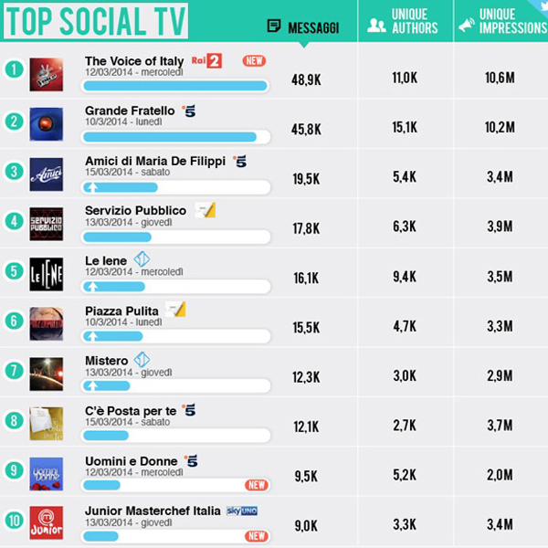 The Voice of Italy, l’anti X Factor in salsa Rai, non fa il pieno dell”Auditel, ma sfonda nella social tv: il debutto del talent di Rai2 si prende il primo posto della classifica Social TV di Blogmeter (10/16 marzo), il talk politico Servizio Pubblico รจ stabile al quarto posto, al quinto Le Iene mentre lโaltro talk di punta di La7 Piazza Pulita guadagna una posizione (dalla settima alla sesta) dalla scorsa settimana; settimo un altra trasmissione della rete guidata da Luca Tiraboschi, Mistero (12.300, 3.000, 2,9 mln).