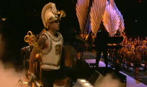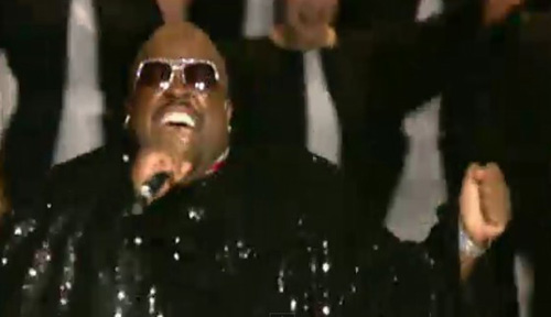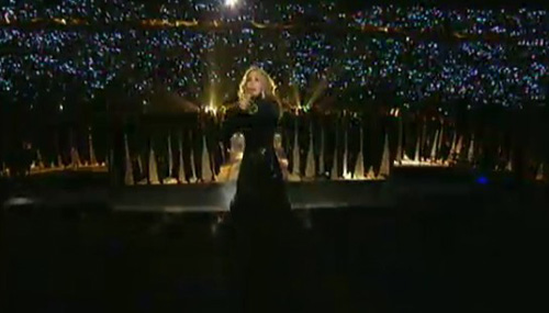 Nemmeno l’arrivo di Cee-Lo Green -in un’entrata maestosa con un plotone di rullanti– può salvarla: l’esibizione sta per volgere al termine con Like A Prayer, con il corpo di ballo e i coristi che tornano in scena e si posizionano sugli spalti tutti seri e composti, con indosso delle tuniche tipiche dei cori gospel di chiesa; intanto il brano (anche questo eseguito più in playback che live) continua, mentre un mini palchetto al centro del main stage s’innalza di qualche metro sorreggendo Madonna e Cee-Lo Green; ora possiamo dirlo: sembra una scena di Sister Act.