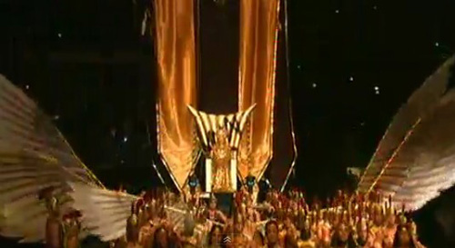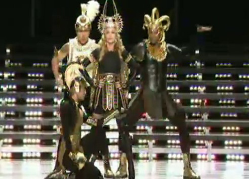 Come un’imperatrice, Madonna fa il suo debutto in campo entrando insieme a una schiera di centurioni: l’abbigliamento sembra essere un mix tra un’imperatrice e una vikinga (su Twitter e Facebook, sono in molti ad accostare la mise alla figura di Liz Taylor in Cleopatra, chi invece parla di aperta e candida ispirazione a Kylie Minogue); la star inizia a intonare -con poca voce ma supportata dalla sua forza di sempre e un playback irrinunciabile- Vogue.