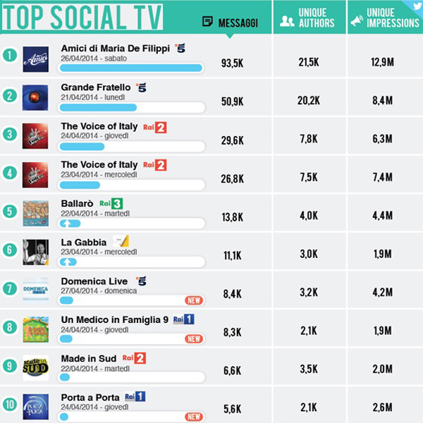 La classifica social tv settimanale stilata da Blogmeter vede il rating dal 21 al 27 Aprile con le prime tre posizioni invariate, con Amici in testa con il doppio dei messaggi rivolti al talent di Canale 5, stabile al secondo posto il reality GF13 sempre dell’ammiraglia Mediaset, mentre The Voice compare due volte all’interno del rating per via del doppio appuntamento della settimana scorsa.