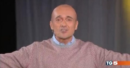 Alfonso Signorini con addosso la maglia del pigiama invita gli spettatori del Tg5 a seguire Kalispéra. È tra le cose più azzeccate di questa edizione.