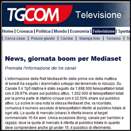 Alla faccia di bronzo non c’è fine: dopo il TG1 anche MEDIASET è riuscita a speculare sui drammatici fatti del terremoto in Abruzzo. Tgcom, riporta un comunicato ufficiale dell’azienda, che indica tutti gli eccellenti risultati d’ascolto fatti grazie alla pelle degli abruzzesi, con un titolo che è tutto un programma: