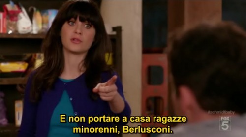 New Girl, la comedy americana della Fox, che racconta la storia di quattro ragazzi, tre maschi e una femmina, che convivono in un loft di Los Angeles, ha citato Silvio Berlusconi nella puntata intitolata Kids. In particolare Jess (la protagonista femminile interpretata da Zooey Deschanel) nella 21esima puntata della prima stagione, deve ospitare per qualche ora la figlia del suo nuovo compagno. Prima dell’arrivo della ragazzina, Jess raccomanda ai suoi coinquilini di comportarsi bene e di evitare di dire parolacce. A Nick (Jake Johnson), che nell’ultimo periodo sta frequentando ragazze molto più piccole di lui, dice (la traduzione è di ItalianSub):