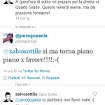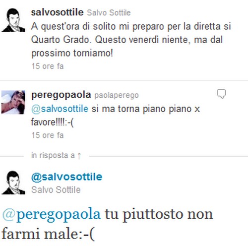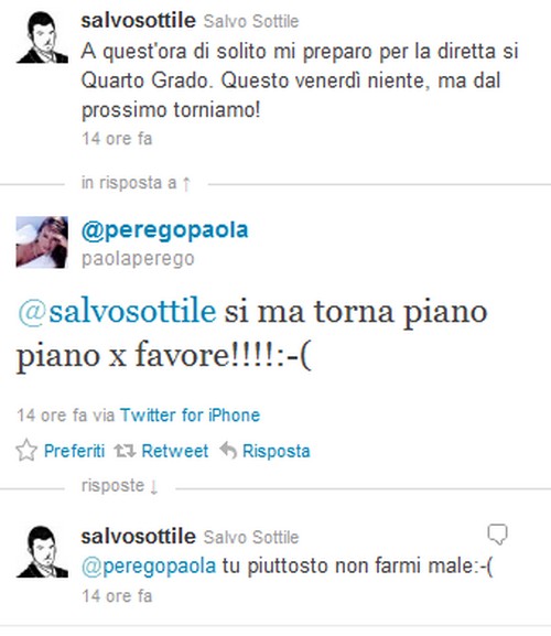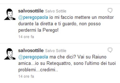 Twitter per i vip è il posto ideale anche per scambiarsi complimenti e cortesie. Soprattutto se a breve i palinsesti televisivi li porranno in sfida diretta. In questo caso parliamo di Paola Perego e Salvo Sottile, i quali da venerdì prossimo saranno in onda rispettivamente su Raiuno, con Attenti a quei due, e su Rete4 con Quarto grado. E a sette giorni di distanza, i due sul social network si dimostrando amici-rivali.Paola Perego, infatti, ha risposto al twit del giornalista Mediaset con il quale ha comunicato il ritorno in onda di Quarto grado, mostrandosi prudente:
