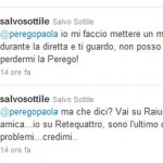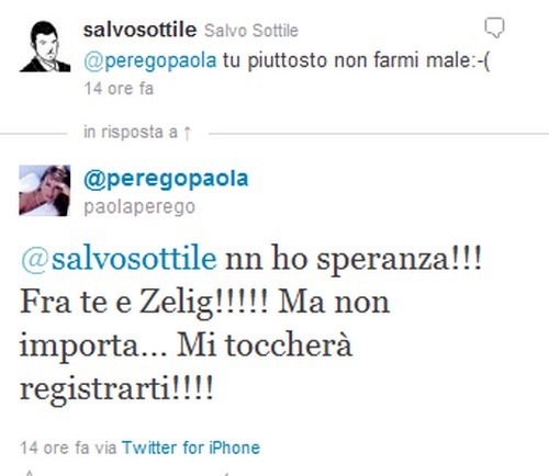 Il botta e risposta tra i due è proseguito, con la promessa della Perego di registrare Quarto grado (dite alla signora Presta che esiste VideoMediaset) e con la risposta altrettanto gentile di Sottile, il quale si definisce “l’ultimo dei problemi” per gli ascolti dello show di Raiuno (in effetti Zelig fa più paura):