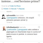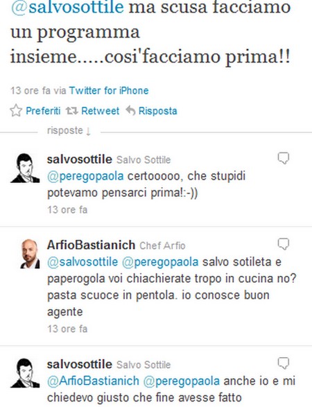Ma, miracoli di Twitter, ecco l’intervento di un altro personaggio televisivo. Direttamente da Mastechef, Bastianich il quale rimprovera ai due di chiacchierare troppo e di non badare alla pasta in pentola. Se volete, tutti i twit potete leggerli nella gallery qui sotto.
