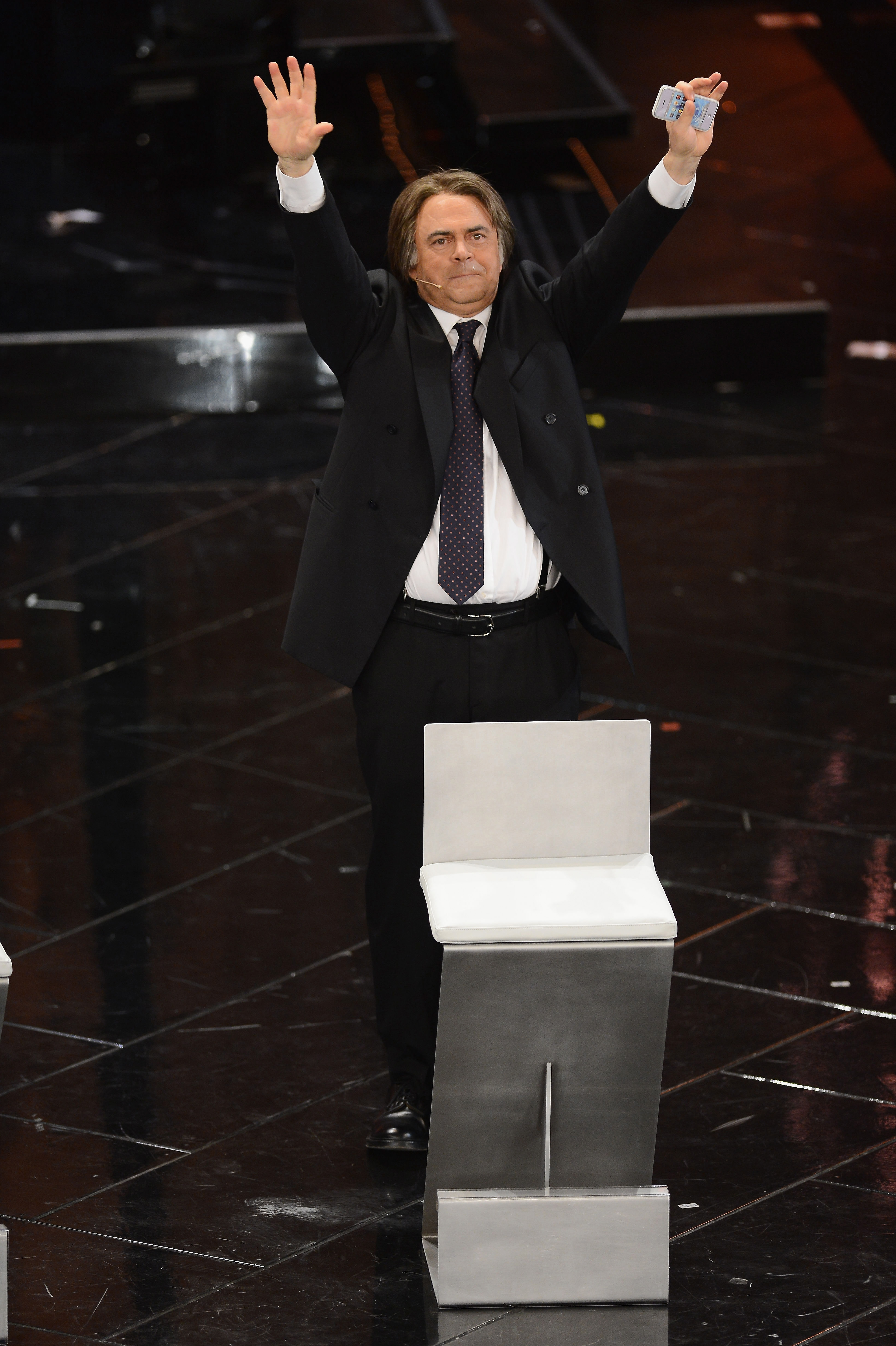 Fabio Fazio rientra alla fine del monologo per salutare Maurizio Crozza e per ringraziare il pubblico dell’Ariston: