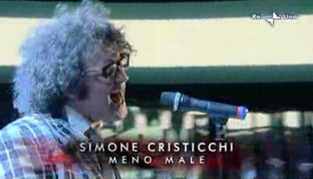 22.53 – Un pezzo molto molto carino, che darà filo da torcere come tormentone al pezzo di Arisa, è Meno male cantata da Simone Cristicchi. Dopo un pezzo impegnato come Ti regalerò una rosa, Cristicchi torna agli albori della sua carriera (vedi Vorrei cantare come Biagio Antonacci). Sarebbe stato divertente vedere la Bruni cantare, e saltellare, questo pezzo. Peccato che non avverrà mai. VOTO: 7 1/2.