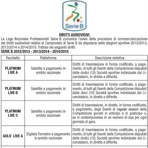Sulla Gazzetta dello Sport di questa mattina è stato pubblicato l’annuncio con il quale la Lega Nazionale Professionisti Serie B ha comunicato l’avvio della procedura di commercializzazione dei diritti audiovisivi relativi al campionato di Serie B da disputarsi nelle stagioni sportive 2012/2013 – 2013/2014 – 2014/2015.
