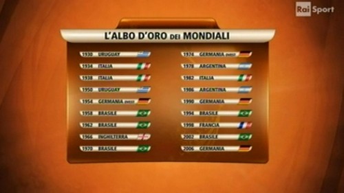 A fare da contraltare, però, ci pensano i grafici di Mondiali Rai Sprint, che preferiscono restare nell’anonimato facendosi chiamare Maurizio e Massimo. Dopo aver fatto a gara a chi faceva più giri di Tequila Bum Bum con Tecca e Altafini di Sky, i due mandano in onda la grafica dell’albo d’oro dei Mondiali che però, dà la Germania come vincitrice del 2006. Insomma, per Marcello Lippi è un estate proprio da dimenticare: non solo è stato massacrato in tutti i modi e in tutti i laghi per il mondiale funesto dell’Italia di cui è stato artefice ma adesso lo hanno anche defraudato del precedente mondiale vinto sul campo.