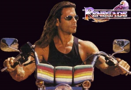 Cos’è Renegade, chi è il personaggio? Capelli lunghi mesciati, una moto, un’impermeabile da giustiziere solitario: sto parlando di Reno Raines/Vince Black (Lorenzo Lamas) un ex poliziotto, che amava il suo lavoro, ma che ha commesso il peccato di testimoniare contro alcuni poliziotti corrotti, che a loro tempo hanno cercato di farlo fuori, ma che per sbaglio hanno ucciso la donna che amava. Dopo essere stato coinvolto involontariamente nell’omicidio, diventa fuggitivo e cacciatore di taglie, anarchico, vestito di jeans e pelle.