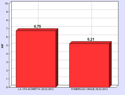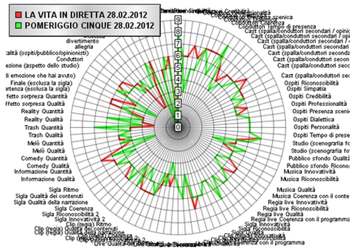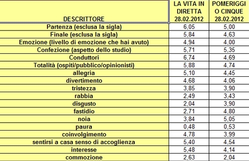 In questo caso i risultati delle due anime del panel, i blogger e gli analisti, sono molto simili: La vita in diretta, ben al di sopra della sufficienza, ha un indice edonico di 6,75 punti su 9 secondo i blogger e di 6,76 punti su 9 secondo gli analisti; Pomeriggio Cinque, appena sufficiente, ottiene un indice edonico di 5,21 dai dati dei blogger e un indice edonico di 5,32 dai dati degli analisti.
