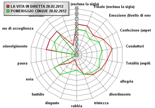 Analisti. In generale La Vita in diretta vince in tutti gli aspetti che incidono positivamente sul generatore edonico, tranne nell’Allegria dove c’è un sostanziale pareggio. Nello specifico si può notare che Mara Venier e Marco Liorni prevalgono su Barbara D’Urso 7 a 5 (confermato anche dalle medie confermano i 6,74 a 4,69), che il programma di Raiuno coinvolge più di quello di Canale 5 6 a 4, che gli ospiti e gli opinionisti proposti da La vita in diretta sono superiori a quelli del competitor 6 a 4,5. Pomeriggio Cinque primeggia nei descrittori che influenzano negativamente il generatore edonico ovvero nel Fastidio 5 a 2, e nel Disgusto 3,5 a 1. Non influisce eccessivamente la noia (4 per La vita in diretta, 5 per Pomeriggio Cinque).