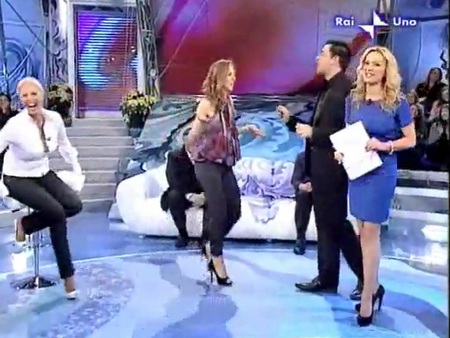 Valentina Vezzali, la dama del fioretto, la scorso sabato era ospite de Le amiche del sabato, ed indossava una maglia fantasia senza maniche, molto leggera e svolazzante, ed un paio di pantaloni a sigaretta neri. Meglio della Lecciso!