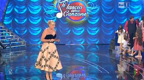 Antonella Clerici, conduttrice di Ti lascio una canzone, la scorsa violta ha indossato un abito stile anni ’50, composto da un corsetto nero con scollatura a cuore ed una gonna ampia color rosa con motivi neri. Non male come look, da 6 + per Antonellina!