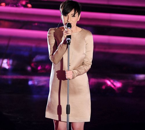 Arisa, per la sua prima serata ha optato per un look semplice, caratterizzato da un dress color cipria a manica lunga, scarpe con tacco e capello corto tutto in ordine. Sono passati i tempi in cui sembrava un fumetto anni ’20 incrociato a Groucho Marx. Un 6 e ½ ad Arisa.