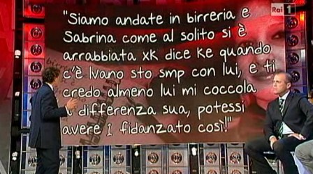 Sentivate la mancanza di Avetrana? A Domenica Cinque, ore 16:53, si inizia finalmente a parlare del delitto della piccola Sarah. Stoccata di Roberto Poletti alla fiction sugli interrogatori di Misseri, appena andata su Domenica In. Il giornalista si ritiene scandalizzato del fatto che i soldi pubblici vengano spesi per queste messinscene. Barbara, ovviamente, non sa a cosa Poletti si riferisca, il pubblico nemmeno, però si applaude sulla fiducia.