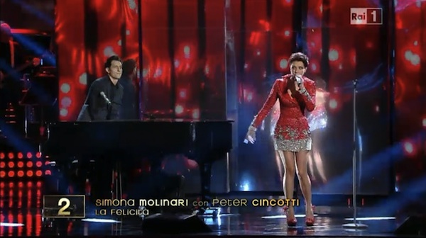Simona Molinari canta con Peter Cincotti. La canzone che passa è Felicità. No, non è un omaggio ad Al Bano e Romina. È una canzone stile anni 30, ritmo coinvolgente. O la ami o la odi. In ogni caso a guardare il vestito di Simona Molinari, sembra più che altro un omaggio a Carolina Kostner…