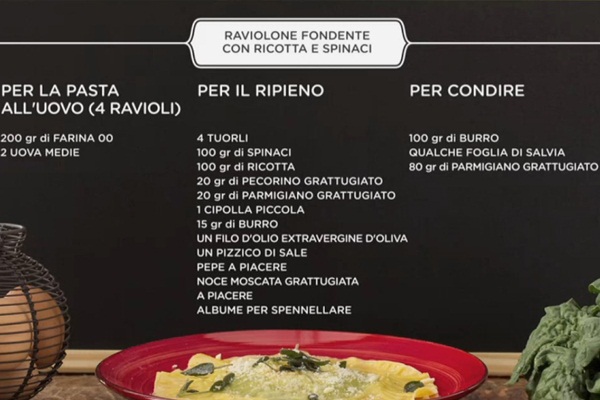 In Cucina con Giallo Zafferano propone sempre ricette che partono da grandi piatti della tradizione culinaria italiana, mostrando delle variazioni moderne e originali: stavolta Sonia Peronaci per Fox Life rielabora la ricetta dei classici ravioli ripieni, preparando un gustoso raviolone fondente con ricotta e spinaci.