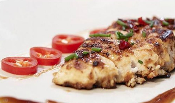 Preparate una padella molto calda per grigliare il pollo, dopo aver cotto il primo lato, giratelo e glassatelo con la crema di burro e salsa di soia e poi fate la stessa cosa dopo aver cotto anche il secondo lato. Mettete il pollo su un piatto, emulsionate con acqua, aceto, salsa di soia e peperoncino, poi fate caramellare leggermente in padella e impiattate.