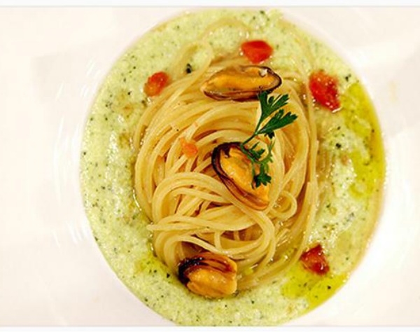 Fate aprire le cozze in una pentola con aglio e olio, pulitele, filtrate l’acqua e poi riportatele ad ebollizione insieme ad altra acqua. Fate saltare i pomodori con aglio e olio, poi metteteli da parte e usate lo stesso fondo per mettere gli spaghetti crudi, facendoli tostare come si fa col riso, poi sfumare con l’acqua di cozze e portare a cottura. Saltate nell’olio le zucchine, cuocetele velocemente e poi frullatele insieme alla mozzarella e un po’ di zafferano, creando una crema. Se necessario, aiutatevi anche con l’acqua di cottura delle cozze.