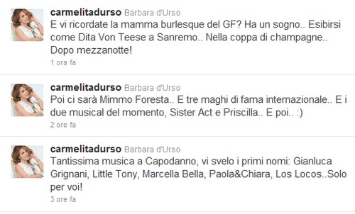 Nemmeno il tempo di darvi conto della classifica dei vip più presenti su Twitter… Barbara D’Urso ha annunciato il cast di Capodanno Cinque, lo show che farà gli auguri di buon anno ai telespettatori di Canale 5, proprio tramite il noto social network (come vedete nella foto d’apertura).